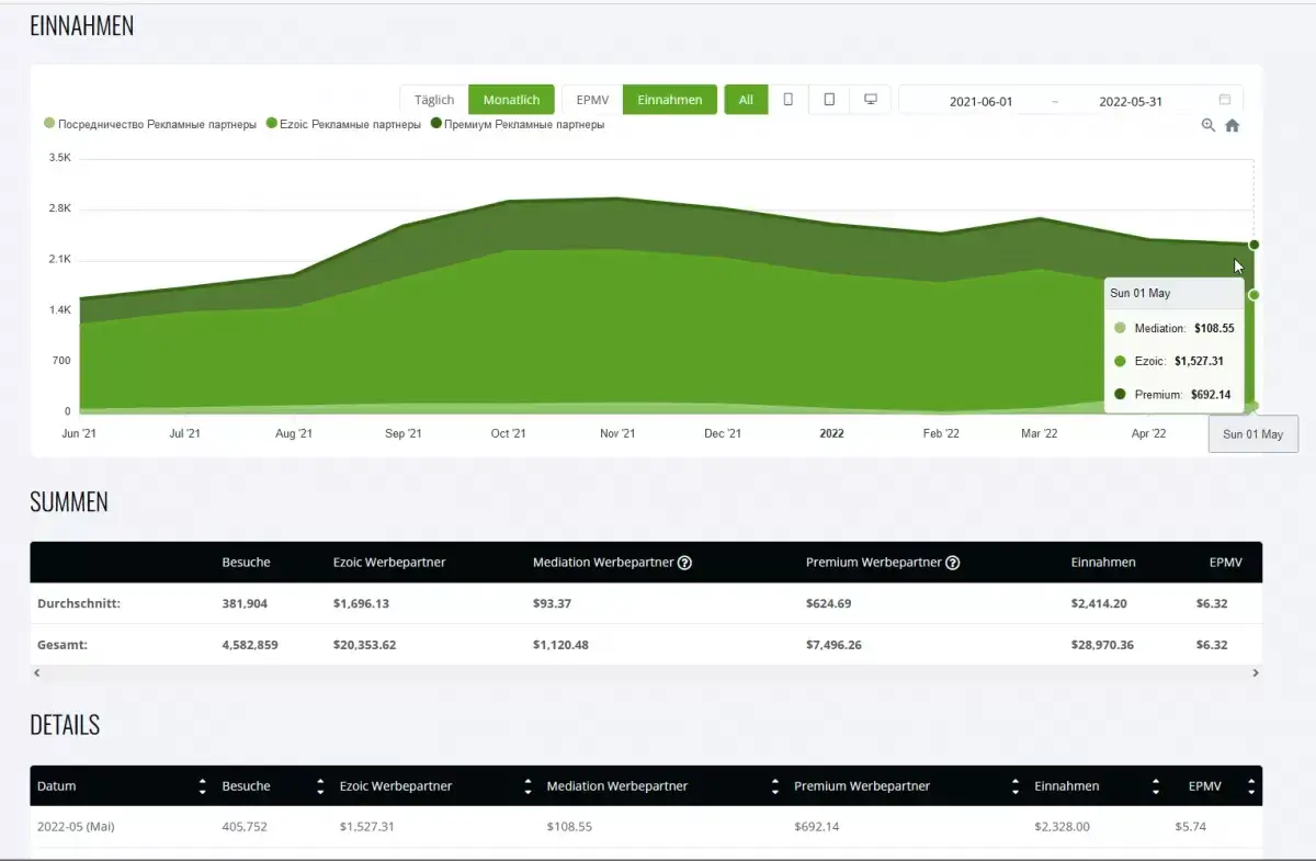 Jetzt werden wir die Rentabilität von Ezoic im Mai direkt im Detail betrachten und Schlussfolgerungen über die Zusammenarbeit ziehen.