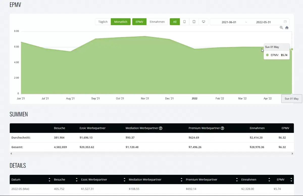 - Einnahmen von YB Digital mit Ezoic Premium im April 2022: 2391,64 $ - 6,00 $ EPMV