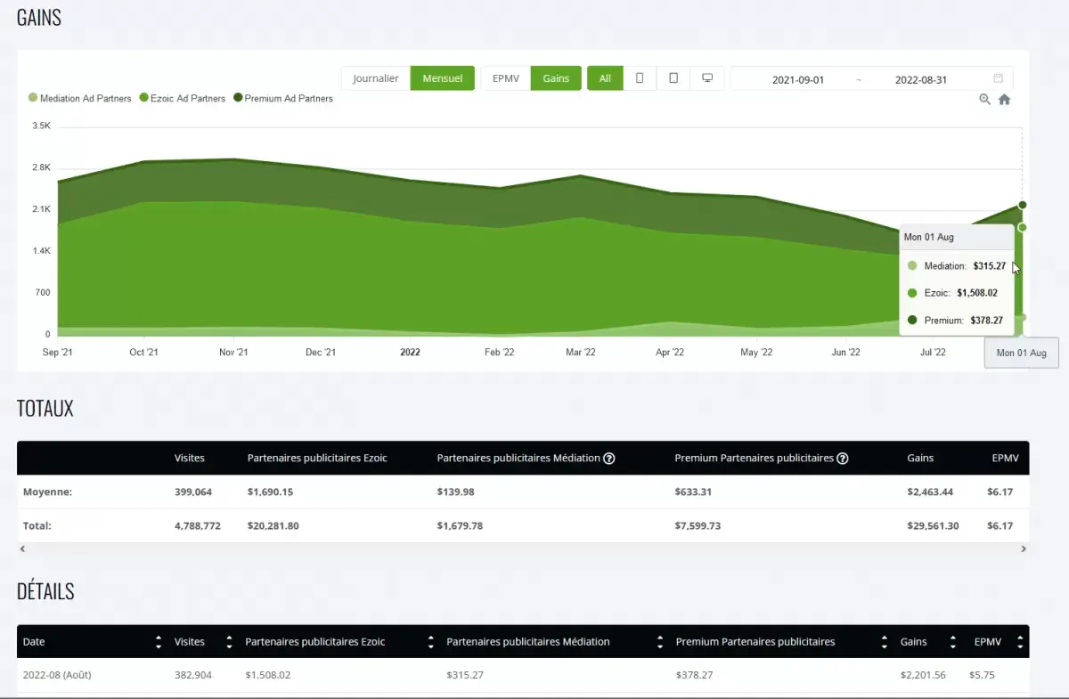Tous nos chiffres ont augmenté, avec une augmentation de 5 % des partenaires publicitaires de médiation, une augmentation de 10 % des partenaires publicitaires premium d'Ezoic et la plus spectaculaire, une augmentation de 56 % des revenus avec les partenaires publicitaires d'Ezoic !