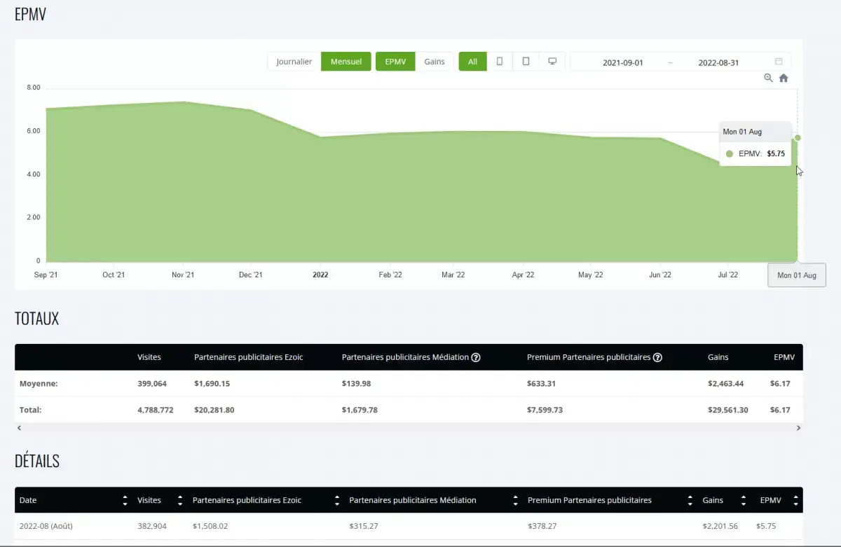 - Revenus du réseau YB Digital avec Ezoic en août 2022
