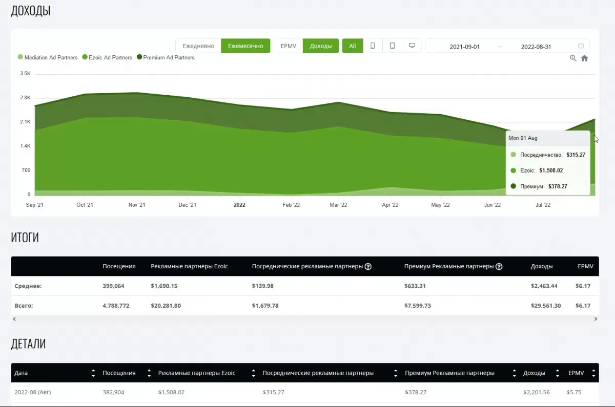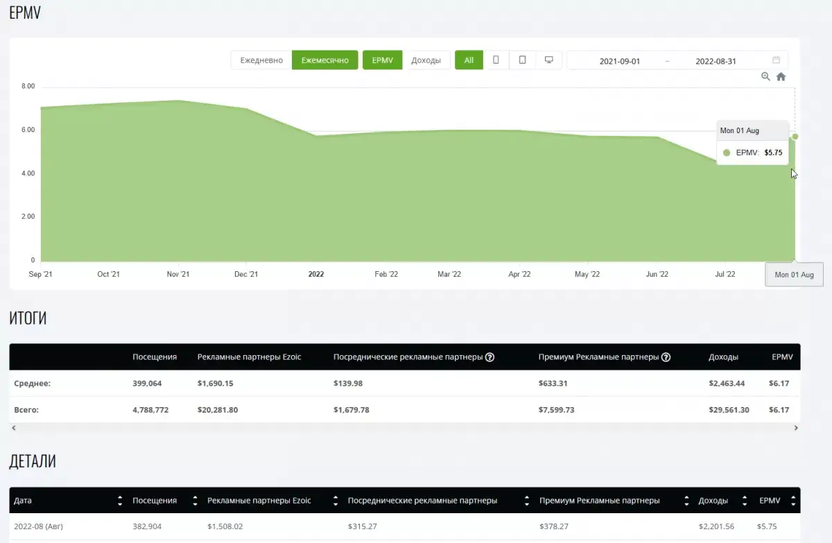 - Сетевой доход YB Digital с Ezoic в августе 2022 года